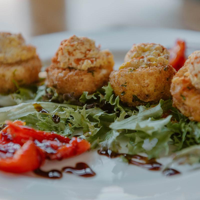 Fried deviled eggs with an onion and bacon jam served with roasted tomatoes and a balsamic glaze