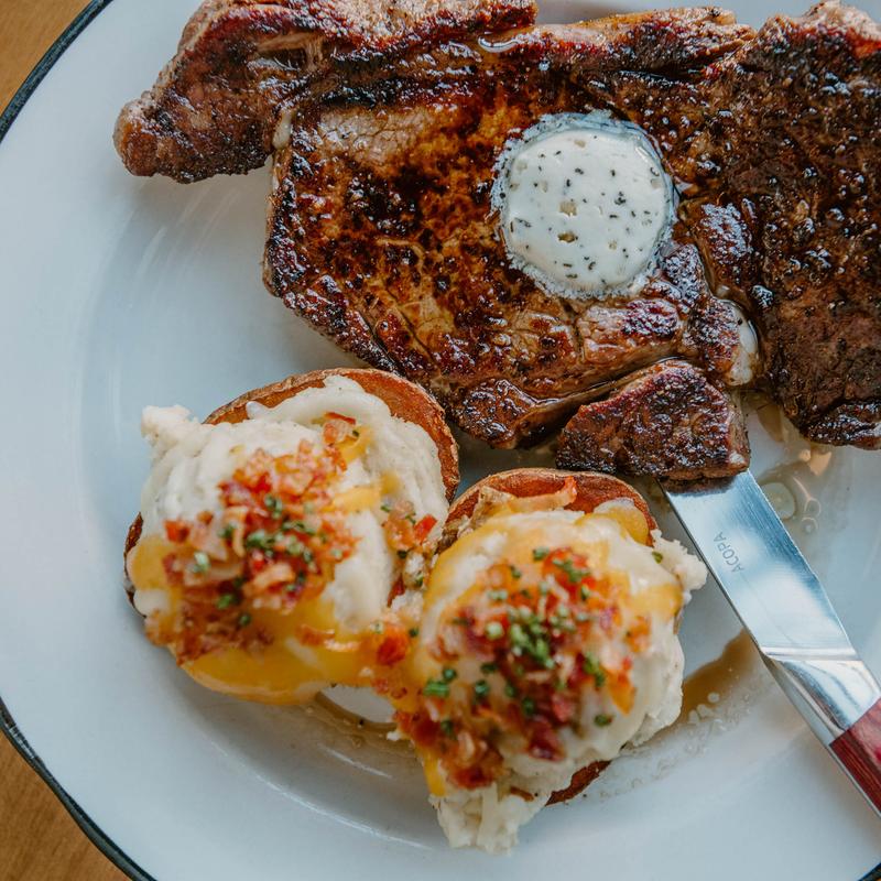 Full flavor, and perfectly seasoned with our made-in-house steak season and topped with maître d butter. Served with your choice of one side & house or caesar salad