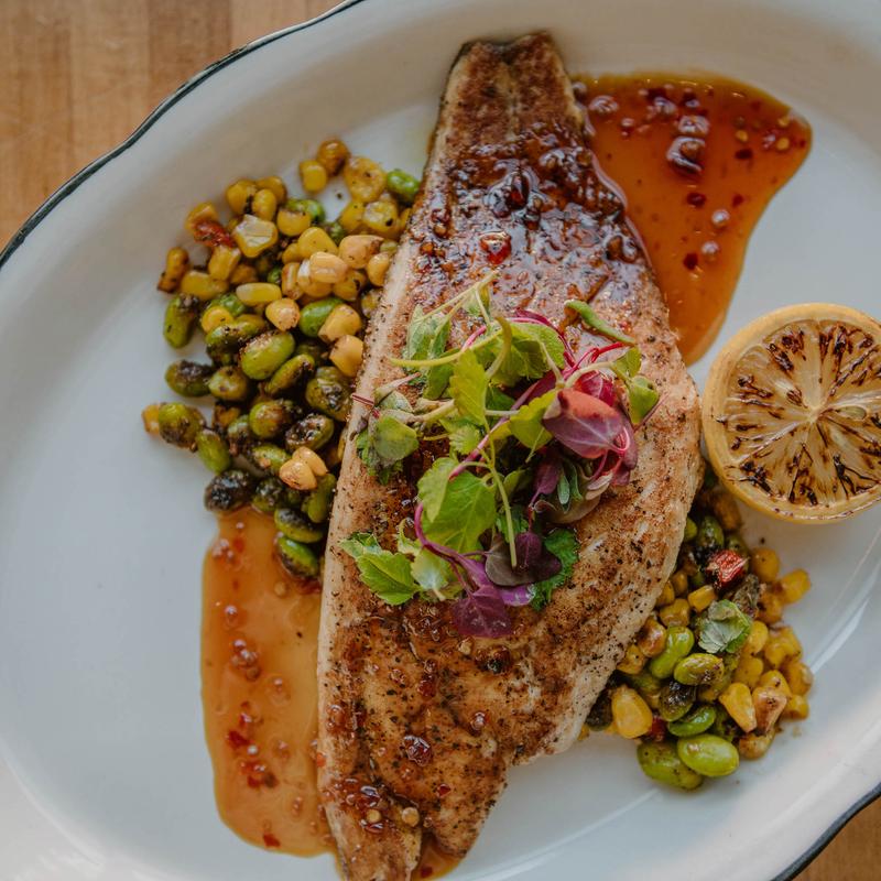 Red snapper grilled and topped with a sweet honey soy glaze and served with an edamame succotash blend