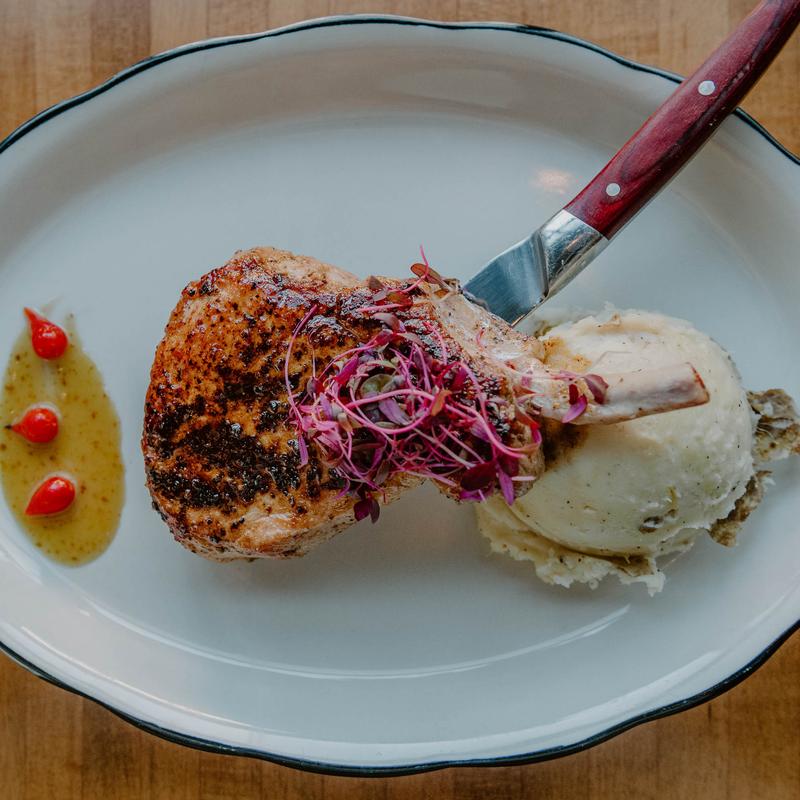 12oz french cut pork chop, glazed with our house-made maple-mustard glaze and paired with creamy garlic mashed potatoes