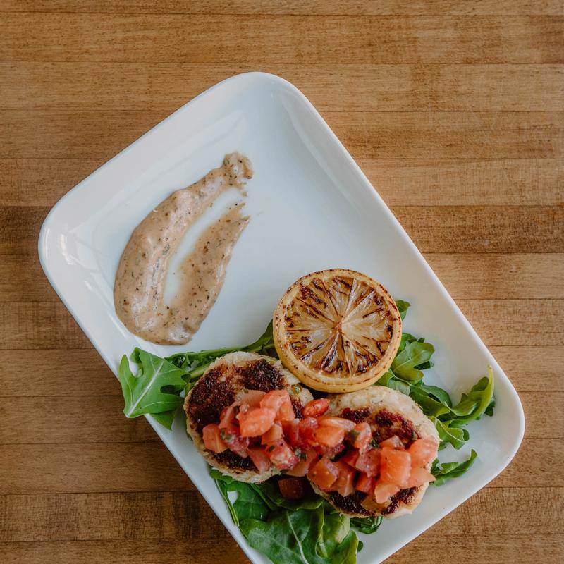 Two deliciously lumped crab cakes drizzled with remoulade sauce topped with tomato and basil
