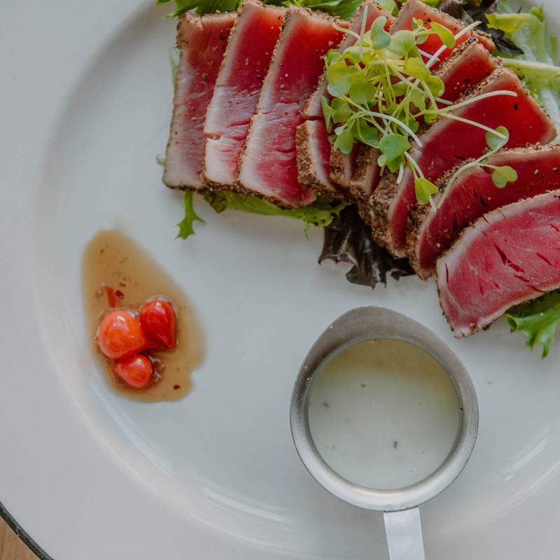 Perfectly seared sashimi ahi tuna served with a made-in-house cucumber wasabi sauce