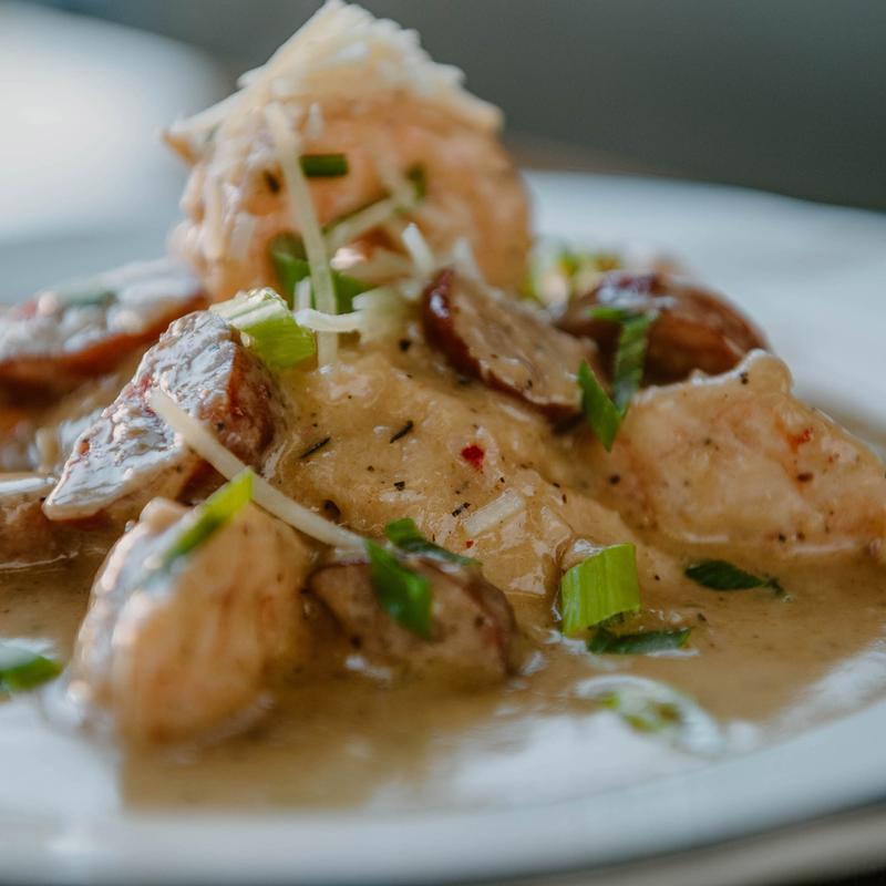 Andouille sausage, garlic, chives, and shrimp over creamy creole pimento cheese grits