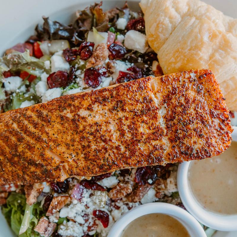 A specially seasoned 8oz Antarctic Atlantic salmon, grilled or blackened, served with one side